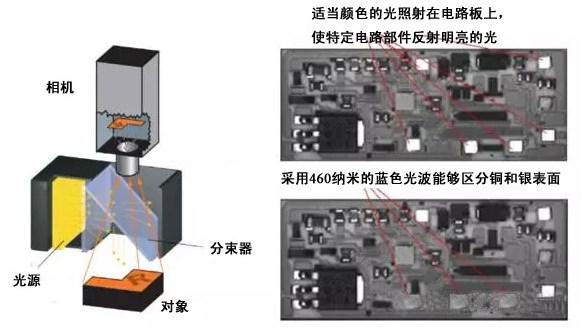 適當(dāng)顏色的光源照射在電路板上,能使特定的電路板部件反射明亮的光,而錯(cuò)誤安裝的部件會(huì)吸收光而呈現(xiàn)出暗色。機(jī)器視覺(jué)系統(tǒng)能夠迅速識(shí)別這些錯(cuò)誤。在這種應(yīng)用中,采用同軸照明技術(shù)及藍(lán)色光源。藍(lán)色波長(zhǎng)(460納米)能明顯區(qū)分銀和銅表面:銅吸收藍(lán)光,出現(xiàn)暗色,銀反射藍(lán)光,出現(xiàn)亮色。